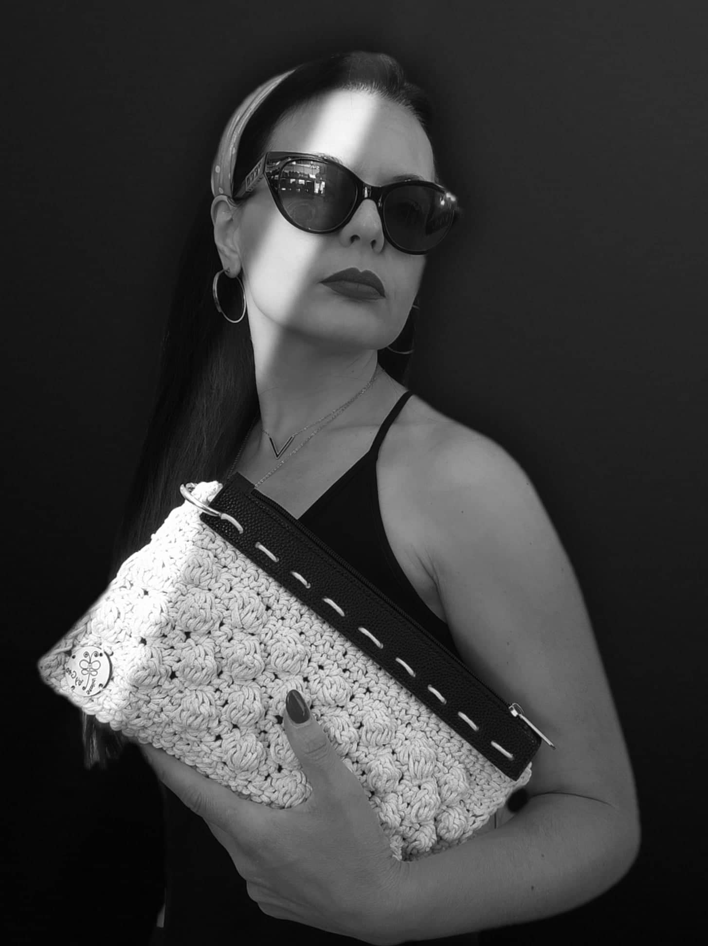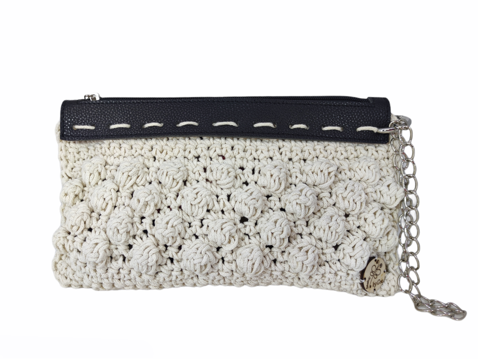 Πλεκτό τσαντάκι χειρός λευκό με φερμουάρ από μαύρο τεχνόδερμα και αλυσίδα καρπού ασημένια.
